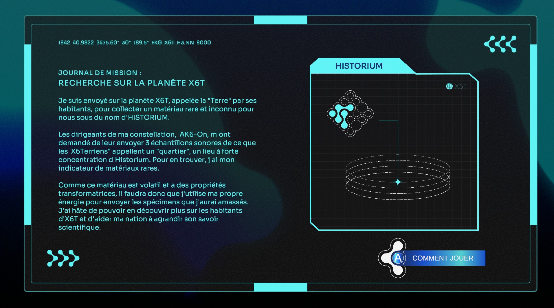 You are a being of pure energy from the planet Ak6-On. You are sent to planet X6T — also known as Earth — by your leaders to collect a rare material: Historium. You must locate and transmit this material, but the journey may profoundly transform you. All of Ak6-On is counting on you!